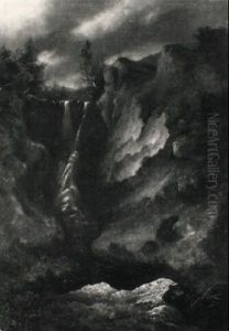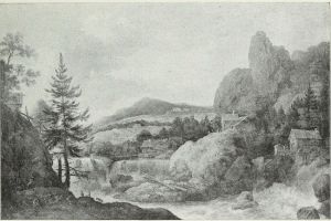 Scandinavisch landschap met waterval, op de voorgrond een tekenende kunstenaar