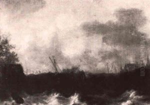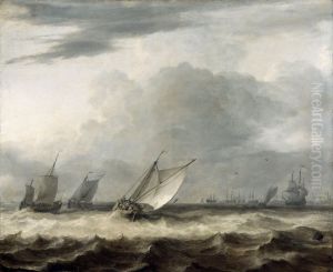 Schepen op een binnenwater met rechts op de voorgrond twee vissers in een roeibootje
