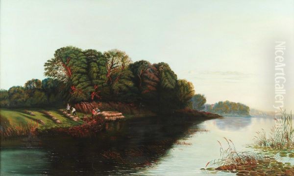 River Scene With Rush Cutters On The Bank
