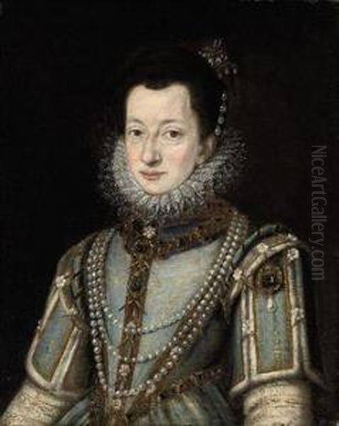 Portrait Of A Lady, Half-length, In A Jewel-encrusted Blue Dress,with A Lace Collar And Pearl Ornaments