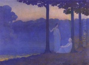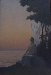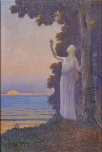 Osbert's work from this period is characterized by the use of soft, diffused light and a palette dominated by blues and violets, creating a dreamlike and otherworldly atmosphere. His figures often appear ethereal and are typically engulfed in serene and contemplative environments. One of his most famous works, 'The Muse at Sunrise' (1898), embodies the quintessential Symbolist preoccupation with the spiritual and the ethereal.
