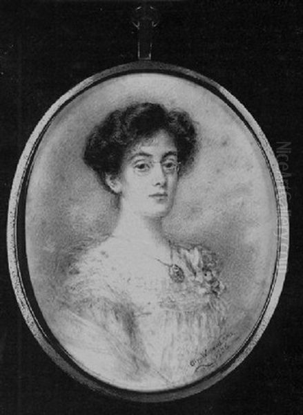 A Lady, Wearing Spectacles, Low-cut Cream Dress And Mauve Shawl About Her Shoulders