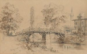 An Ottoman Lady Walking With A Child With A Mosque Behind