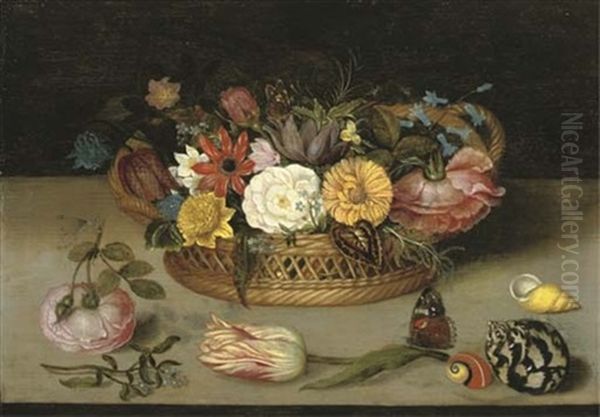 Roses, Tulips And Other Flowers In A Basket With Flowers, Shells, And A Butterfly On A Ledge