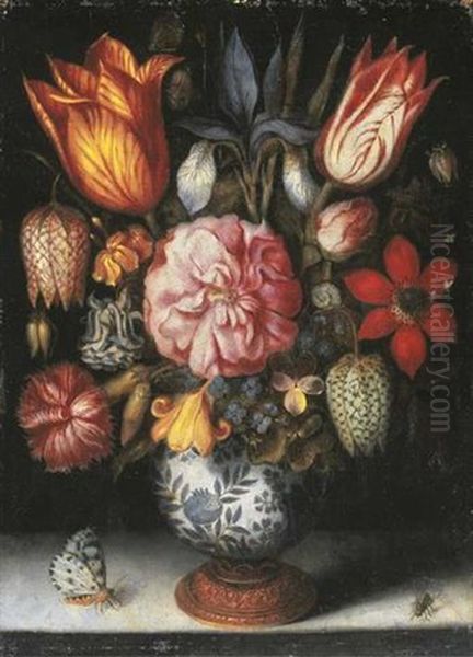 Tulips, A Rose, An Iris, A Carnation, Snakeshead Fritillaries, A Columbine And Other Flowers In A Porselein Vase, With A Butterfly And A Fly On A Stone Ledge