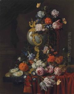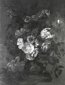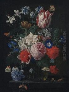 A Still Life Of Tulips, Roses, Morning Glory And Other Flowers In A Sculpted Bronze Vase In A Niche