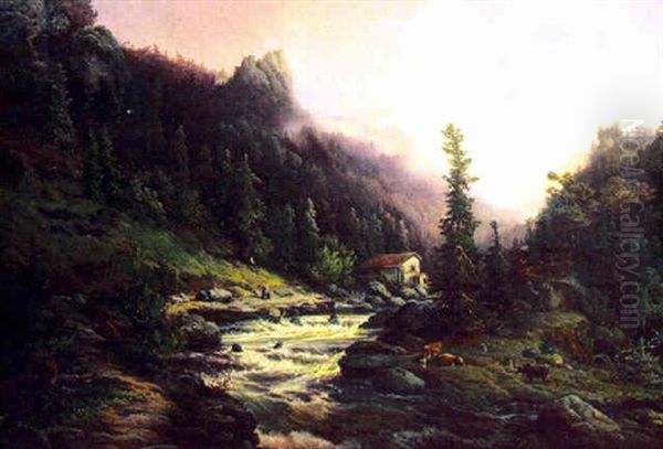 Alplandskap Med Kvinna Och Barn Samt Kor Vid Fors Med Hus
