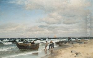 Fishermen and boats at the beach of Vedbaek, Denmark.