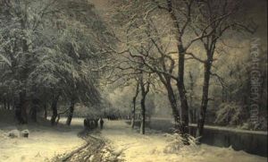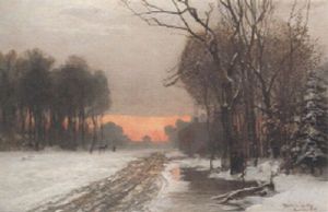 Vinterlandskap Med Promenerande Figurer, Solnedg+ngsst,mning