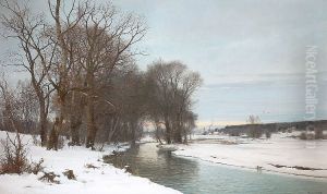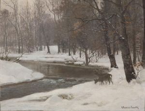 Winter landscape from South Germany with deer, woodlands and a stream.