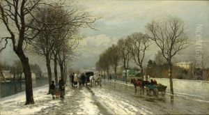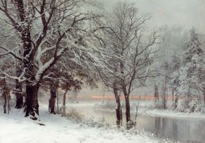 Winterlandschaft mit Nymphenburg bei Abenddammerung.