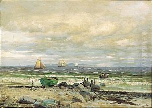 Fishermen and boats at the beach of Vedbaek, Denmark.