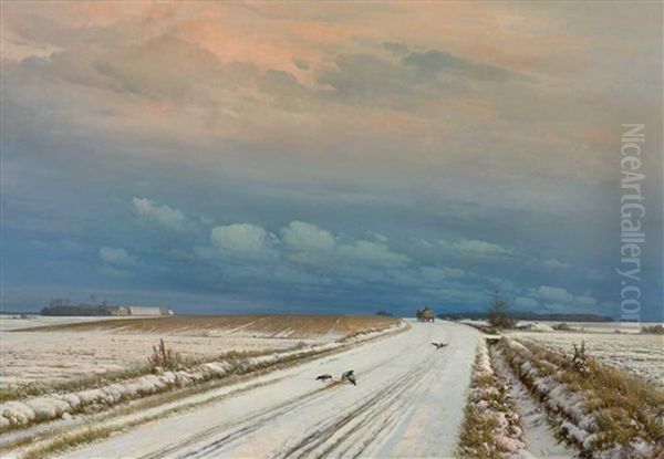 Winterliche Landschaft Mit Verschneiten Feldern, Saatkrahen Und Heimkehrendem Fuhrwerk