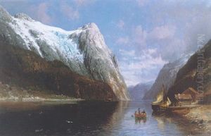 Norsk Fjordparti Med Sejlskibe Og Rob+de Ud For En Bygd