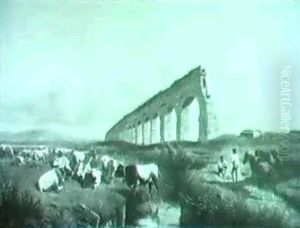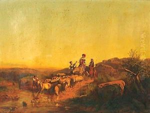 Junge Italienerin Auf Dem Maultier, Im Gesprach Mit Dem Hirten, Dessen Herde Am Brunnen Steht