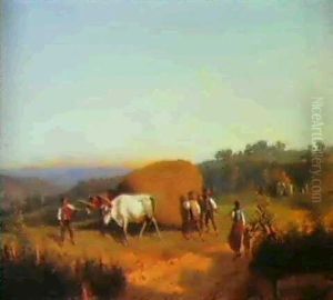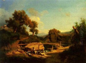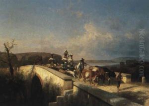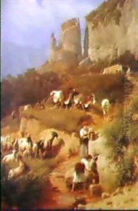 Figure, Horse-drawn Cart And Goats Along A Mountain Path In An Expansive European Landscape