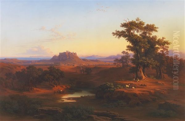 Shepherds In A Bucolic Athenean Landscape With The Acropolis And Piraeus Beyond
