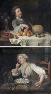 Jeune Homme A Table Devant Des Fruits (+ Jeune Femme A Table Devant Des Herbes; Pair)