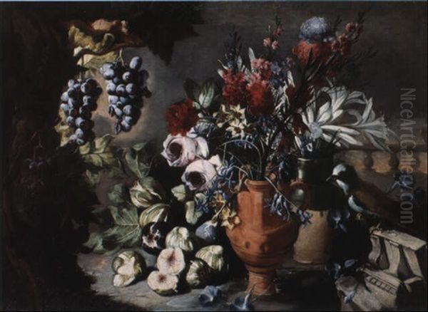 Nature Morte Au Vase De Fleurs, Oiseau Et Fruits