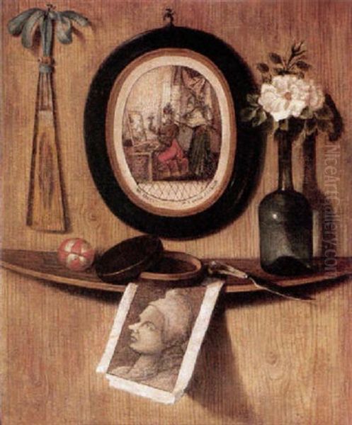 Trompe L'oeil Of Prints, A Fan, A Rose In A Wine Bottle, A Knife, A Pot And A Ball On A Ledge On A Wooden Wall