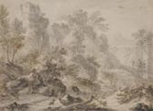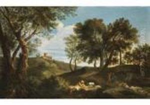 A Classical Landscape With Figures And A Herdsman Near Awaterfall, A Hilltop Fort Beyond