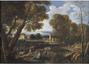 An Italianate Landscape With Washerwomen Andfigures Resting On Rocks Beside A Pool, A City In Thedistance