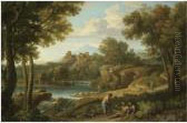 A Classical Landscape With Figures And A Herdsman Near Awaterfall, A Hilltop Fort Beyond