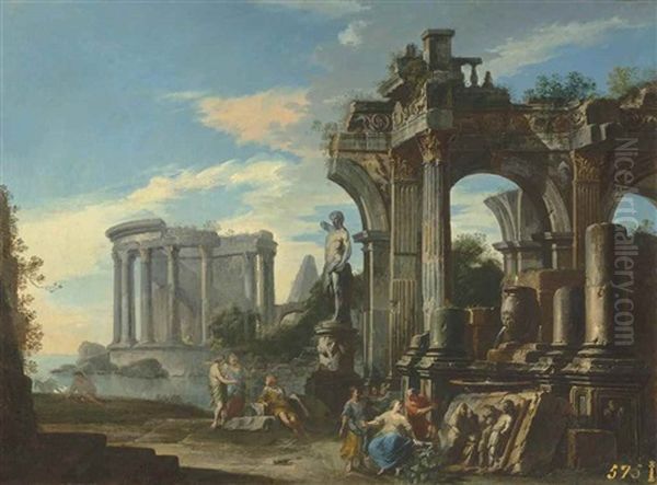 An Architectural Capriccio With Figures Conversing Among Classical Ruins