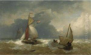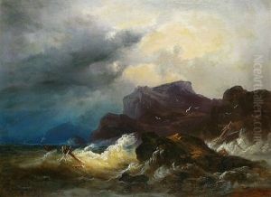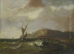 Sailing Ships In A Stormy Sea Near The Cliff Line