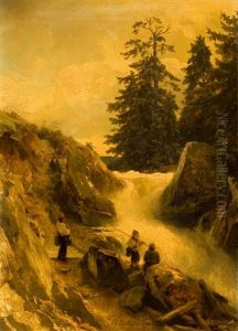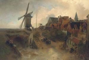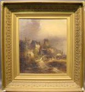 Hirtin Mit Kuh An Der Tranke, Im Hintergrund Ein Bauerngehoft