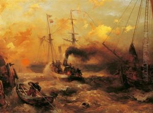 Einlaufender Dampfer Auf Tosender See. Vorn Ein Ruderboot An Einer Belebten Landungsbrucke