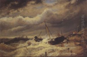 Fischerboote In Bewegter See Mit Ausblick Auf Eine Stadt Und Windmuhle