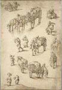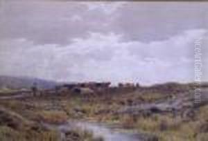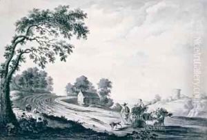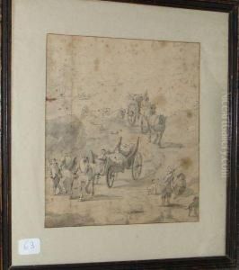 A Village Scene With Waggoners On A Road And Boors Watering Their Cattle In A River