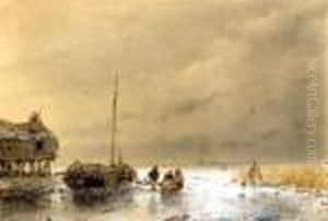A View Of A Frozen Canal With Figures Near A Horse Drawn Slegde