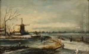 A Winter Landscape With A Windmill And Skaters On The Ice