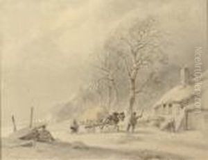 A Winter Landscape With Figures Loading A Horse Sleigh