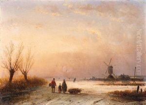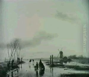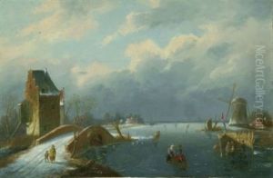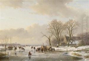 A Winter Landscape With Figures On The Ice, A Koek En Zopie In The Distance