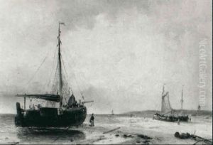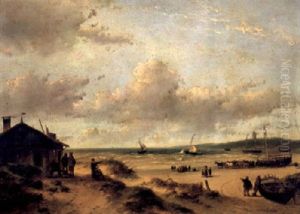 A Coastal Scene With Fisherfolk And Beached 'bomschuiten'