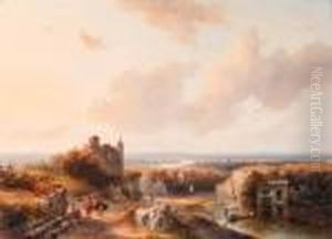 An Extensive Summer Landscape With Travellers And A Hay-wagon On A Sandy Track