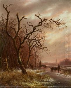Skaters And A Horse-drawn Sledge On A Frozen Waterway At Dusk
