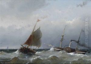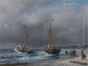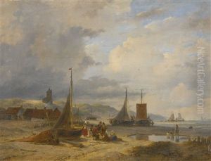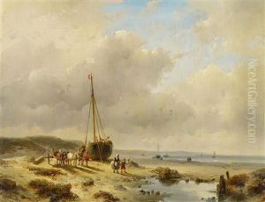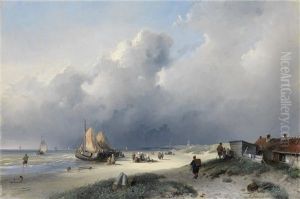 A Coastal Scene With Bomschuiten On The Beach And Villagers Gathering Around A Fishmonger