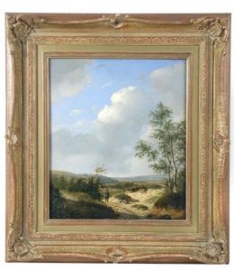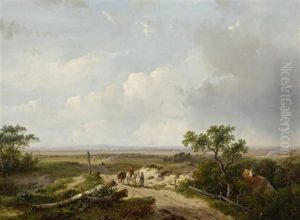 Farmer And Donkey On A Heathland Path, A Shepherd With Flock In The Background