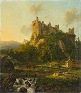 A Summer Panorama With The Ruin Of A Castle; And A Frozen Waterway