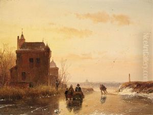 An Extensive Winter Landscape With Skaters And A Horse-drawn Sledge