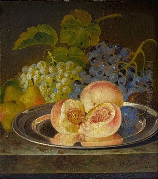 Stillleben Mit Blumen In Einer Glasvase (+ Stillleben Mit Fruchten Auf Einer Steinplatte, 1824, Signed; Pair)