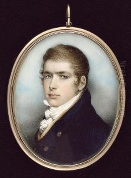 A Young Gentleman, Wearing Dark Blue Coat, Yellow Waistcoat And Frilled White Chemise And Tied Stock