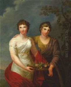 Personifikation Der Freundschaft Und Dankbarkeit. Zwei Stehende, Weibliche Figuren, Einen Korb Mit Blumen Haltend