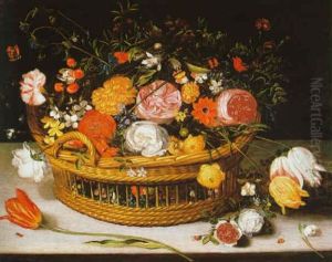 Still Life Of Flowers With Roses, Tulips And Iris In A Wooden Tub