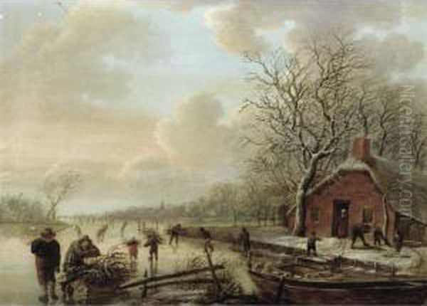 A Frozen River Landscape With Skaters And Men Collecting Firewood