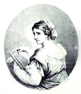 Portrait of the artist, bust-length, a pen and folio under her arm